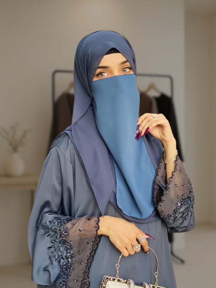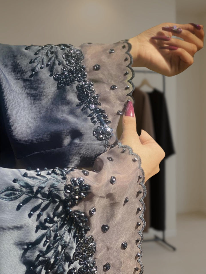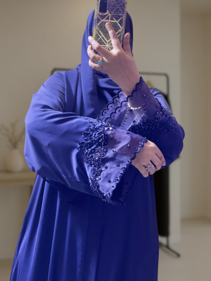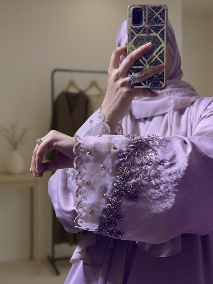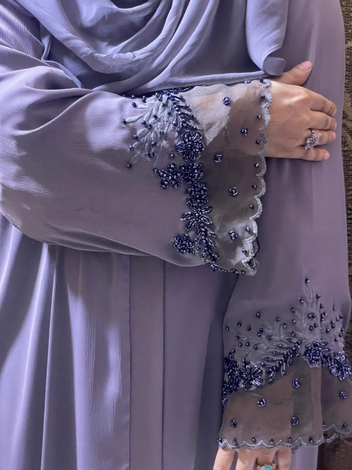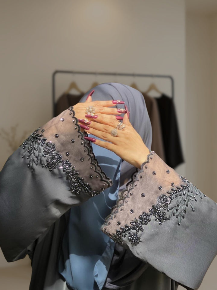 This elegant two-piece abaya β crafted from premium Arabian Nida fabric with delicate tissue embroidery and hand embellishment β redefines modest luxury.