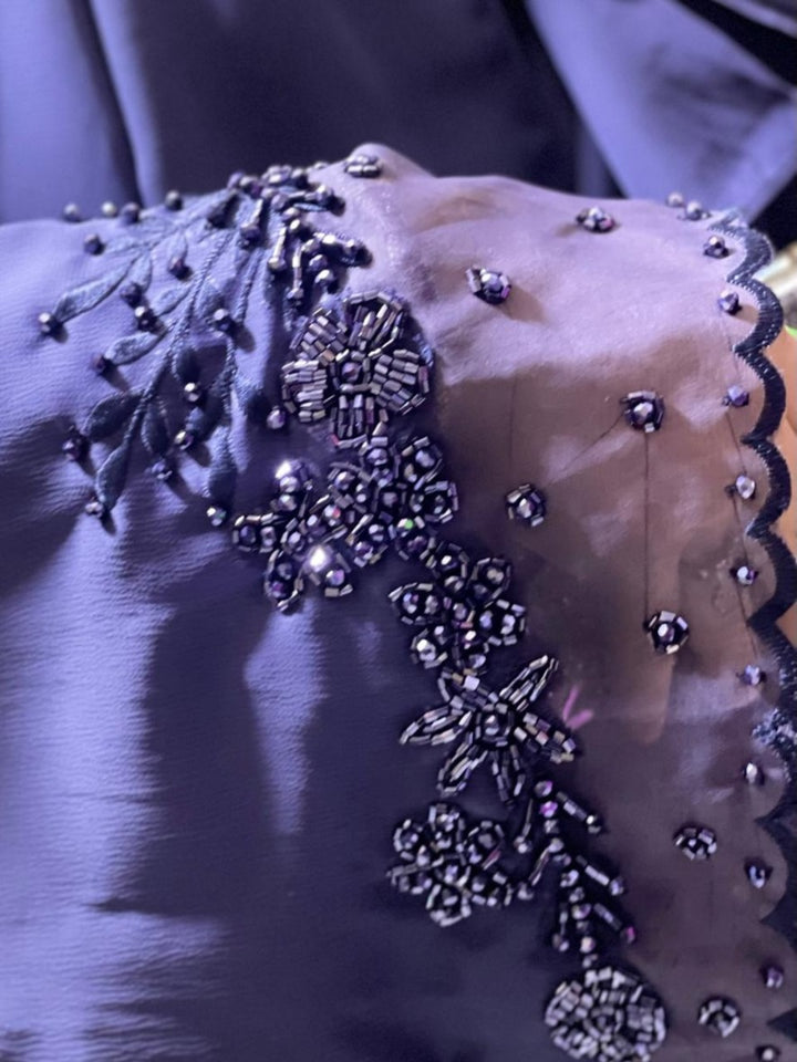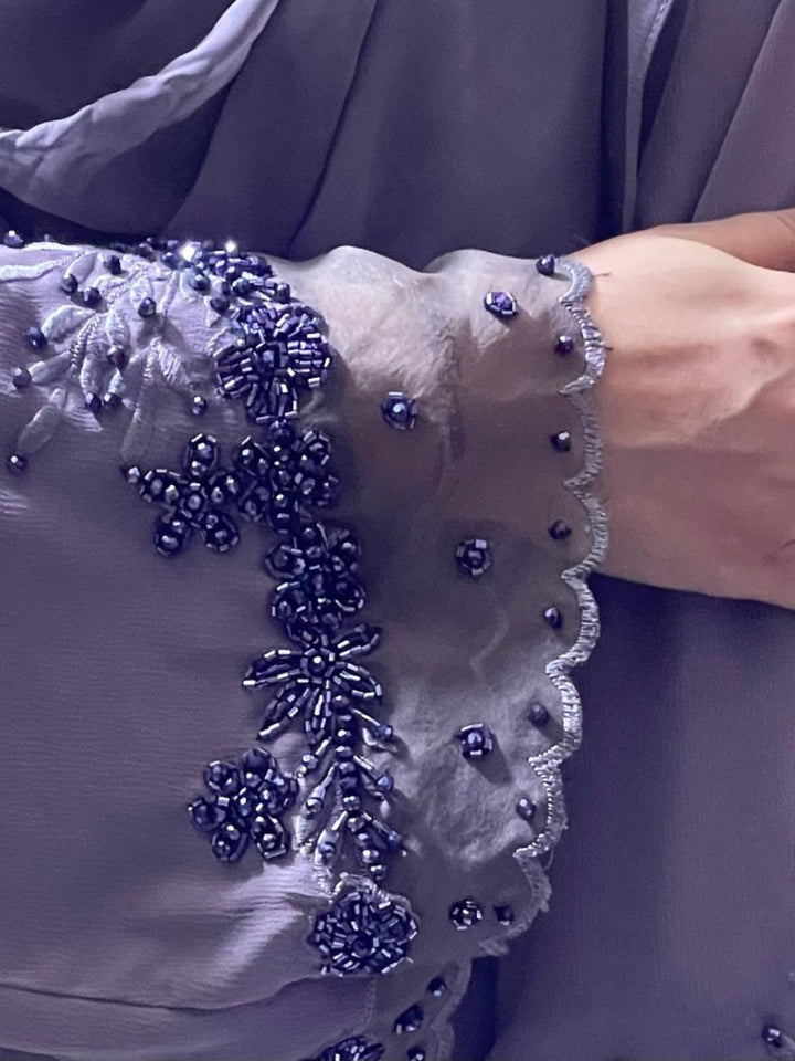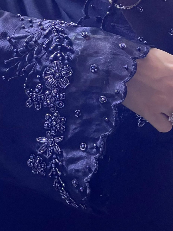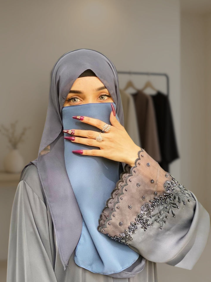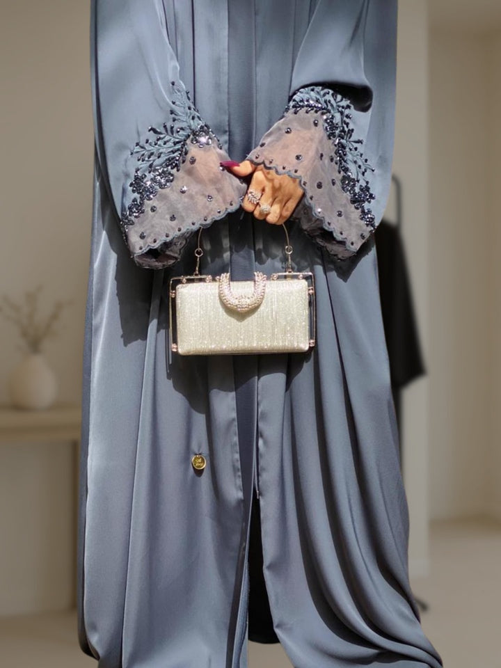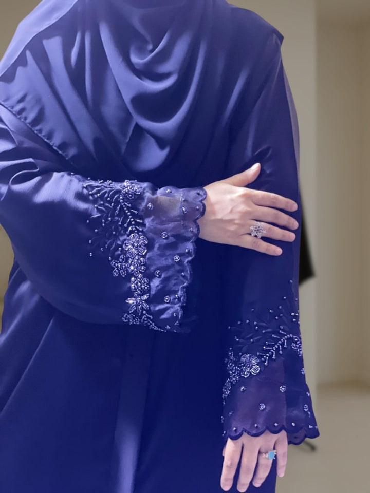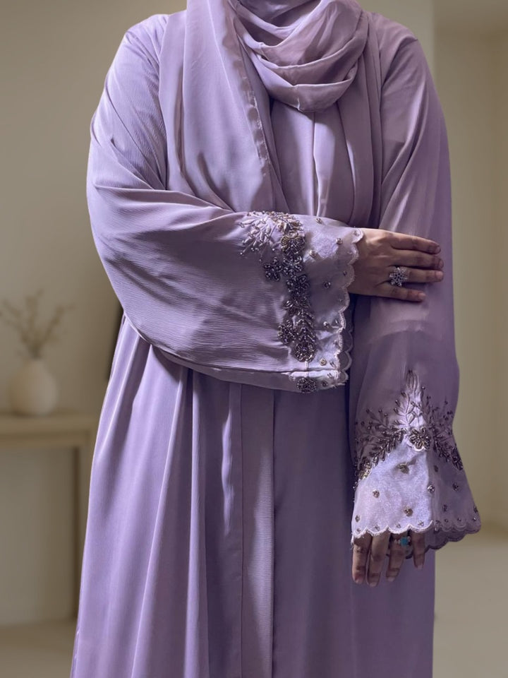This elegant two-piece abaya β crafted from premium Arabian Nida fabric with delicate tissue embroidery and hand embellishment β redefines modest luxury.