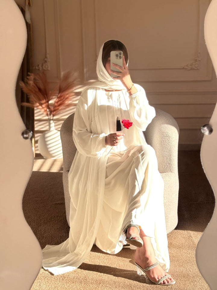 Lightweight, breathable, and thoughtfully designed, it ensures ease of movement while maintaining a refined, modest silhouette. The pristine white fabric adds a touch of purity and serenity, making it the perfect choice for spiritual journeys or elegant everyday modest wear.