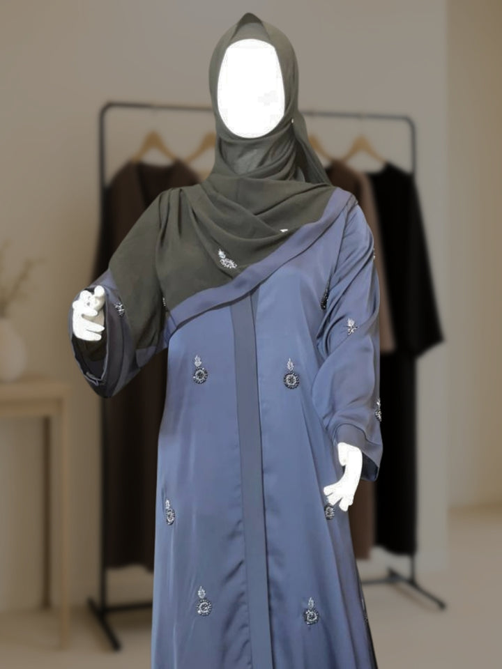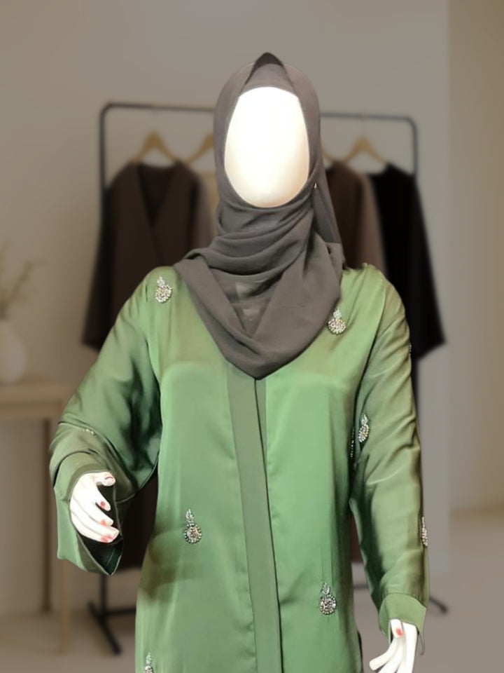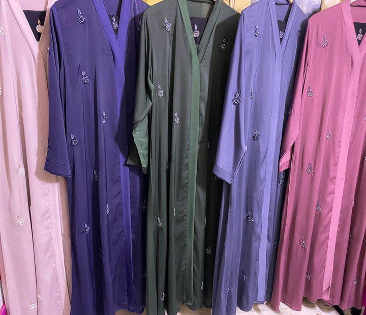 Its standout feature is the delicate scattered handwork motifs across the front and sleeves, adding just the right amount of charm without overwhelming the design. Available in multiple rich shades, this abaya offers flexibility to suit both casual gatherings and semi-formal occasions.
