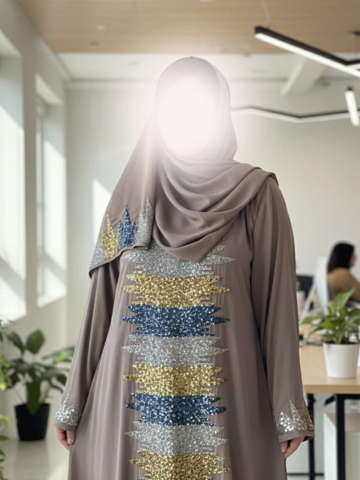 Embrace luxury with The Regal Hand Work Abaya, crafted from premium Arabian Nida and adorned with exquisite hand-applied sequins in gold, silver, and blue tones.