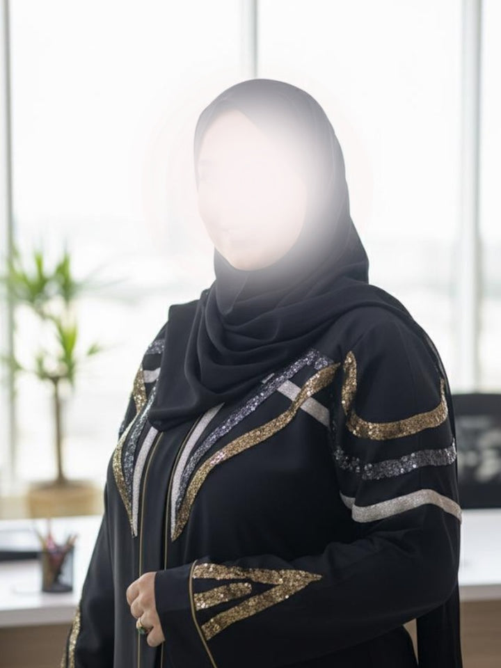 This elegant hand-worked abaya is a masterpiece of craftsmanship and sophistication. Designed in premium black crepe fabric, it features intricate front and back hand embellishment with gold and silver sequence work. The matching stoler/scarf carries the same detailing, completing the luxurious ensemble. Ideal for formal gatherings, business events, or special occasions — where grace meets modern style.